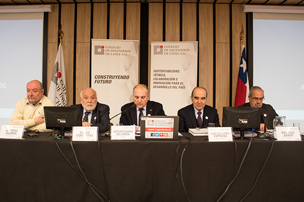 De izquierda a derecha, el secretario general, Alfredo Guzmán; el primer vicepresidente, Sergio Contreras; el presidente del Colegio de Ingenieros, Arturo Gana; el segundo vicepresidente, Juan Guillermo Espinosa y el tesorero, Mauricio Baker.