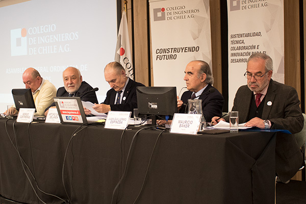La asamblea fue conducida por el presidente del Colegio de Ingenieros, Arturo Gana, en compañía del Comité Ejecutivo integrado por el primer vicepresidente, Sergio Contreras; el segundo vicepresidente, Juan Guillermo Espinosa; el secretario general, Alfredo Guzmán y el tesorero, Mauricio Baker. En conjunto entregaron la información de la Memoria de Actividades 2018, el Balance y Estados Financieros del Ejercicio 2018 y el informe de la Comisión Revisora de Cuentas. Asimismo, se presentó el programa de actividades y presupuesto de ingreso y egresos del ejercicio en curso. El abogado del Colegio, Juan Salvo, estuvo presente durante la Asamblea y los asistentes tuvieron la oportunidad de hacer sus observaciones.