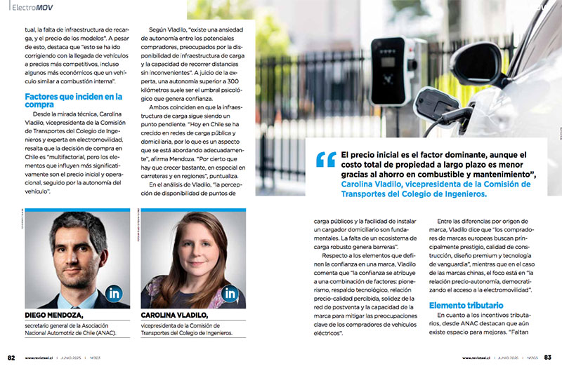 Te invitamos a leer el artículo “Radiografía al mercado de vehículos eléctricos en Chile: ¿Qué falta para dar el salto masivo?”, publicado en la última edición de Revista Electricidad. En esta publicación, Carolina Vladilo, vicepresidenta Comisión Salud, junto a Diego Mendoza Benavente, Secretario General de la Asociación Nacional Automotriz de Chile (ANAC A.G.), comparten perspectivas sobre los principales factores que influyen en la decisión de compra de estos vehículos en el país.