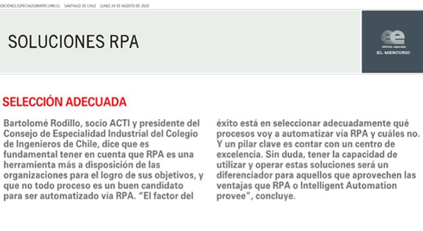 septiembre 10, 2020 septiembre 10, 2020Categorías Artículos Ingeniería IndustrialBartolomé Rodillo, presidente del Consejo de Especialidad Industrial, comenta sobre automatización robótica de procesos en el diario El Mercurio
