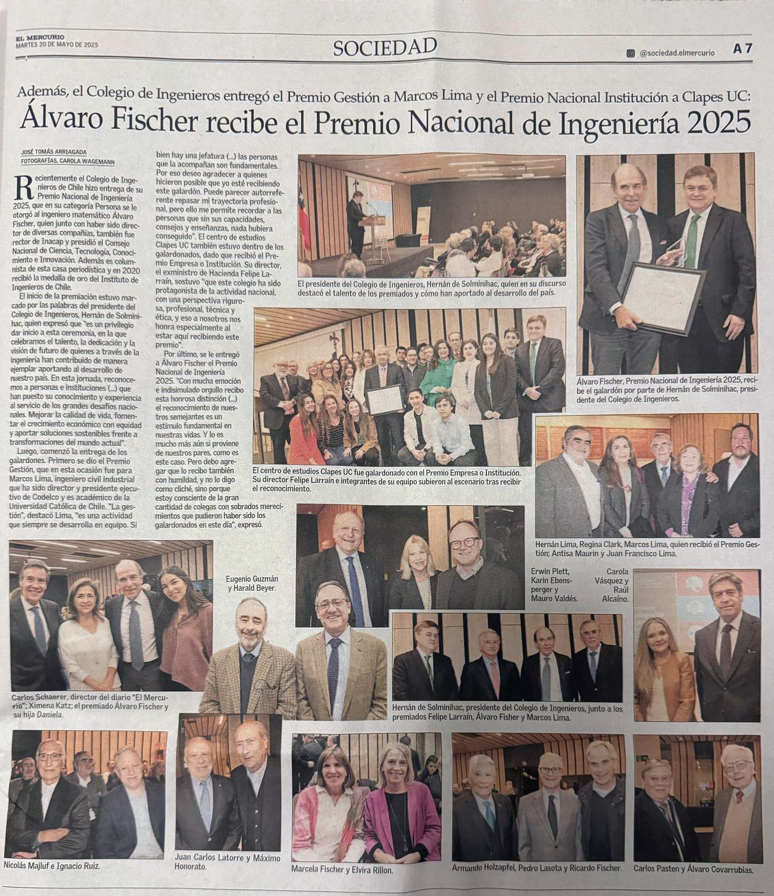 El miércoles 14 de mayo se realizó en el edificio del Colegio de Ingenieros la ceremonia de entrega de Premios Colegio de Ingenieros de Chile, primer semestre 2025 para reconocer a destacadas personalidades e instituciones que, a través de la ingeniería, han realizado aportes significativos al desarrollo del país, a la equidad social y a la transformación sostenible de sus sectores.