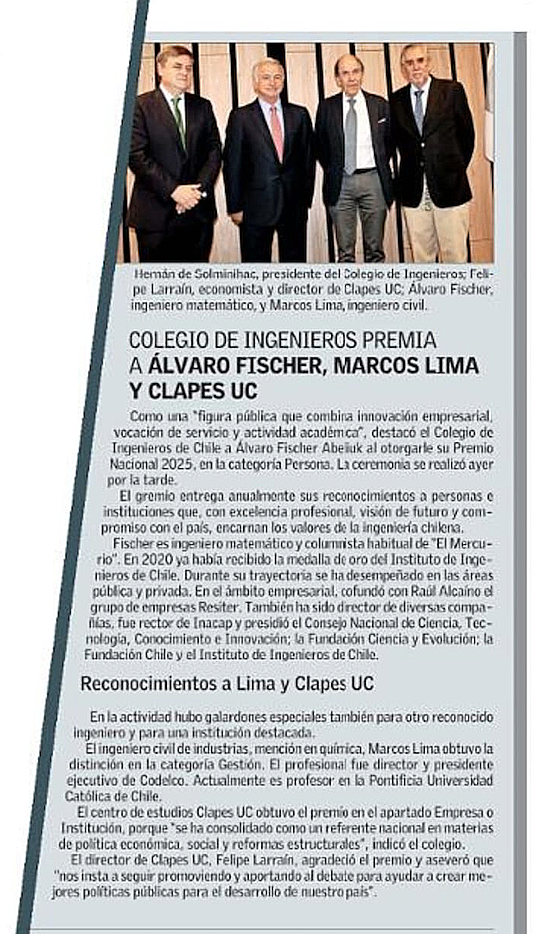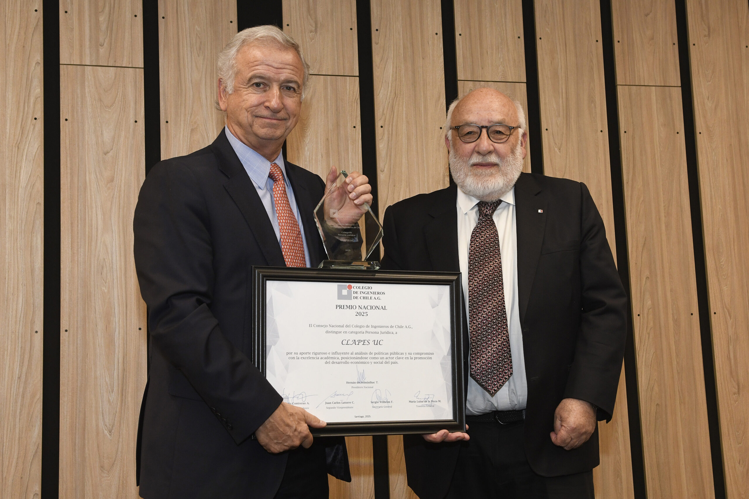 El Premio Nacional Institución fue recibido por CLAPES UC por su contribución a la formulación de políticas públicas con base en evidencia, excelencia académica y visión transversal. CLAPES UC se ha consolidado como un referente en el debate económico y social de Chile y América Latina. Este premio fue recibido por el director de CLAPES UC, Felipe Larraín.