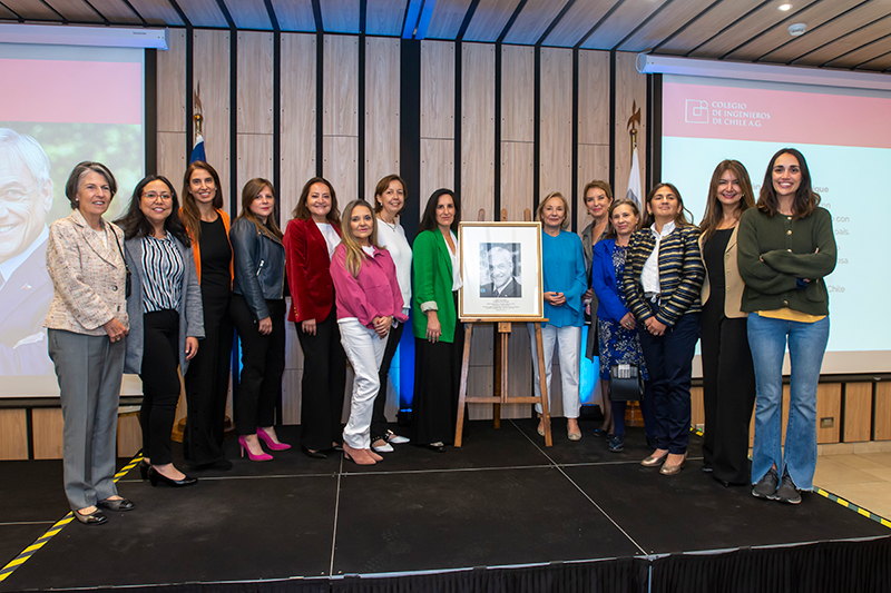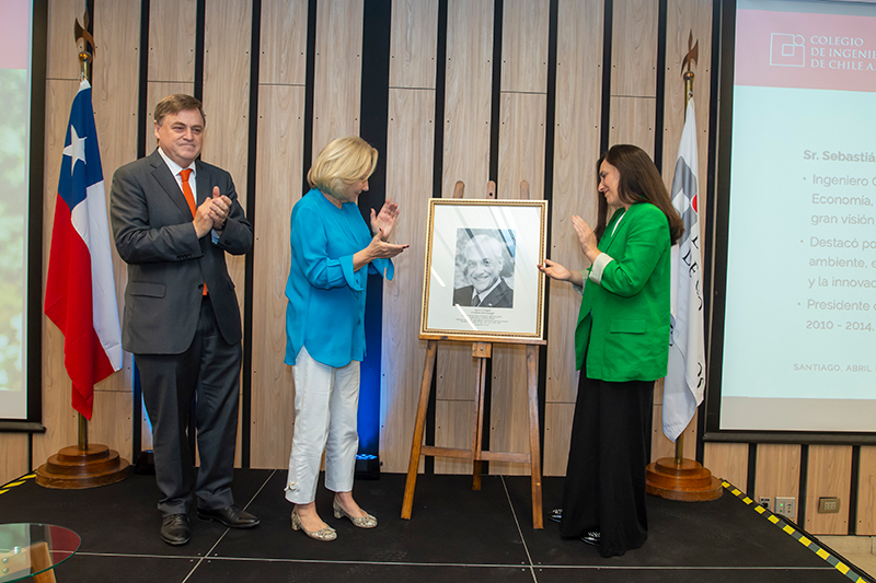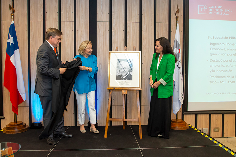 Finalmente, el presidente del Colegio invitó a Cecilia Morel y a Cecilia Piñera a subir al escenario para el descubrimiento de la fotografía del ex mandatario, la cual será integrada a la Galería de Ingenieros Distinguidos en el edificio del Colegio de Ingenieros.