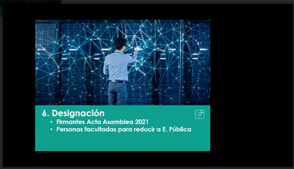 Por acuerdo del Consejo Nacional y conforme con los Oficios N°2453 de 18 de marzo y N°3977 de 28 de mayo, ambos de 2020, ambos emitidos por la Unidad de Asociaciones Gremiales y de Consumidores del Ministerio de Economía, Fomento y Turismo, que dispusieron recomendaciones para las celebración de asambleas ordinarias a través de medios remotos, en donde podrán tratarse todas las materias que ordene la Ley o el estatuto del Colegio, se llevó a cabo la Asamblea General Ordinaria de Socios del Colegio de Ingenieros de Chile A.G. el viernes 30 de julio de 2021, a las 12:00 hrs. en primera citación, y a las 12:30 hrs. en segunda citación.