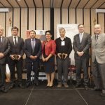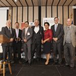 Sergio Jarpa, presidente Voces Mineras A.G., junto a los participantes de la sesión de camiones autónomos, Luis Etchevers, de Caterpillar; Darko Louit, de Komatsu; Cristián Olivares, de Minera Centinela; Irene Astudillo, moderadora y socia de Voces Mineras A.G.; Iván Violic, presidente Consejo Zonal Metropolitano del Colegio de Ingenieros de Chile y Arturo Gana, presidente del Colegio de Ingenieros de Chile.
