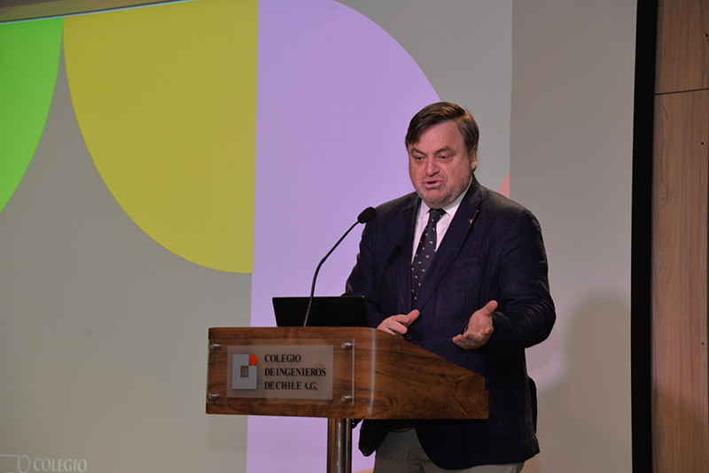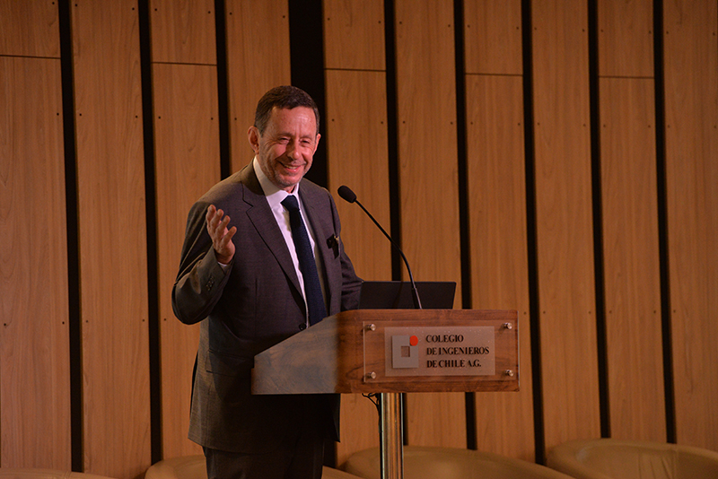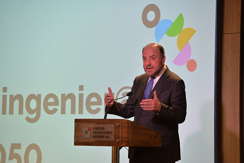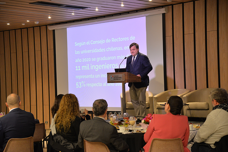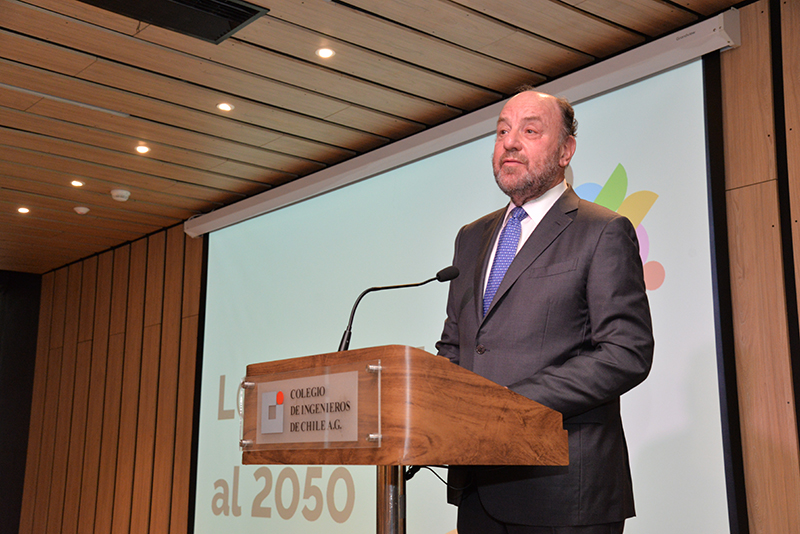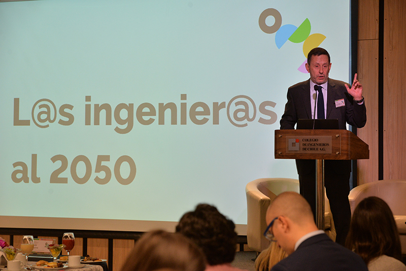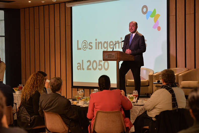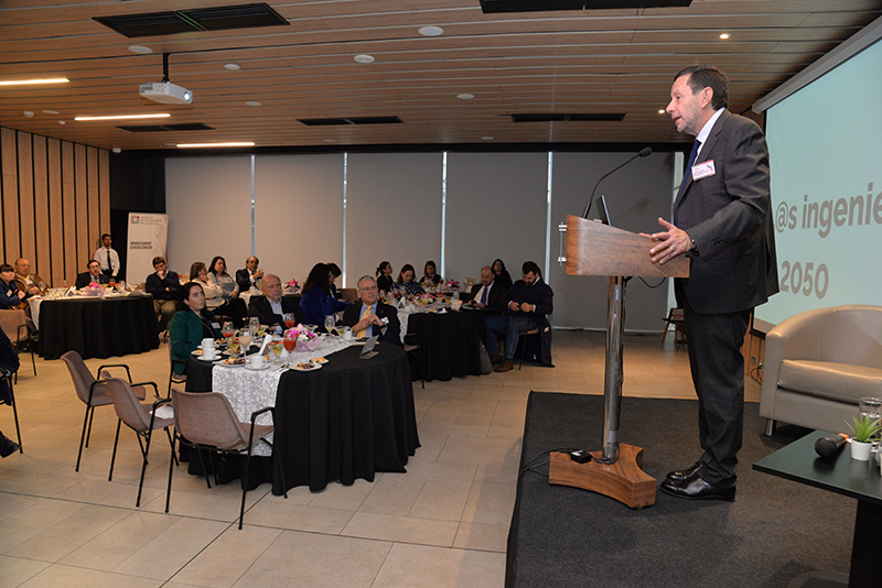 Andrea Rojas, gerente general del Colegio dio la bienvenida a los asistentes para entregar la palabra al presidente de la Asociación Gremial, Hernán de Solminihac. El ex ministro de Estado y ex decano de la Facultad de Ingeniería de la Universidad Católica comenzó su presentación resaltando las diferentes perspectivas y enfoques de los ingenieros y de cada especialidad, como el espíritu de integración del Colegio: “En la fundación del Colegio de ingenieros, se lee en la historia, que uno de los aspectos más complejos en la negociación inicial, fue quienes debían formar parte de nuestro colegio, y concluyeron que nuestro sello debía ser el carácter integrador de todas las disciplinas, reuniendo en un mismo gremio a los ingenieros civiles, comerciales, aeronáuticos, defensa y navales”. Asimismo destacó que no debemos olvidar que la ingeniería está hecha por personas y para personas a pesar de que nos desafiamos con la llegada de nuevos escenarios como Chat GPT y la inteligencia artificial. Por otra parte De Solminihac recalcó que según el Consejo de Rectores de las universidades chilenas, en el año 2020 se graduaron más de 11 mil ingenieros, lo que representa un incremento de un 53% respecto al año 2010 permitiendo al país atraer inversión extranjera y desarrollo. Al finalizar su presentación dejo planteadas las siguientes interrogantes a los expositores ¿Cómo preparamos a los ingenieros y a las ingenieras de aquí a 2050?, ¿Debemos preocuparnos sólo de armar una red?, ¿Cómo podemos aportar desde la ingeniería en el desarrollo de las políticas públicas?, ¿Cómo podemos atraer más mujeres a la profesión y al colegio? Y¿Qué rol debemos tener como colegio de ingenieros en esta mirada de la disciplina al año 2050?