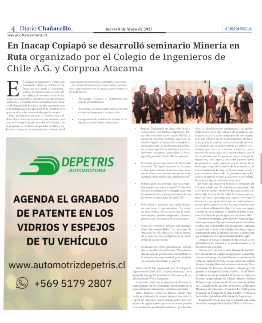 Organizado por el Colegio de Ingenieros de Chile y la Corporación para el Desarrollo de la Región de Atacama (CORPROA), el seminario contó con la colaboración de las consultoras Surmedia y Symnetics. Ambas jornadas convocaron a más de un centenar de personas, incluyendo a autoridades regionales, altos ejecutivos de compañías mineras, representantes del Clúster Minero, empresas socias, estudiantes y miembros de la sociedad civil, lo que reafirma el interés transversal por construir una minería más conectada con los territorios.