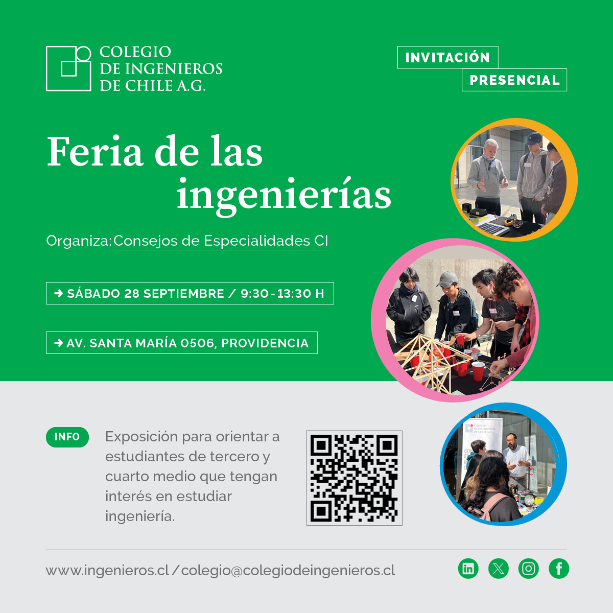 Desde ya, extendemos la invitación a todos los estudiantes de tercero y cuarto medio interesados en la ingeniería a participar en la tercera versión de la Feria de las Ingenierías, que se realizará el último sábado de septiembre de 2025. Será una oportunidad única para seguir explorando el fascinante mundo de la ingeniería y descubrir las posibilidades que ofrece para su futuro.
