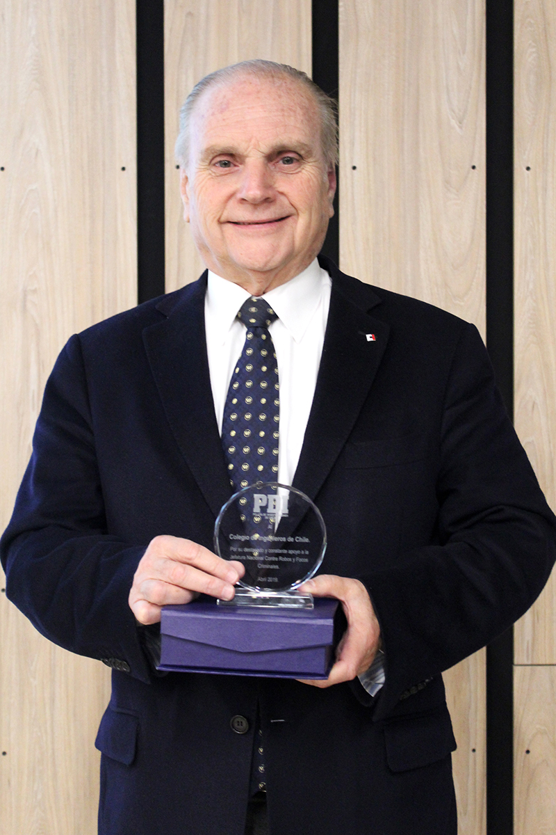 Al finalizar el evento, el Prefecto Jorge Valdés Castro, Subjefe de la Jefatura Nacional contra robos y focos criminales, y en representación de la Policía de Investigaciones de Chile, entregó un reconocimiento a Eduardo Costoya por su contribución desde el ámbito de las telecomunicaciones a la Institución. El presidente del Colegio de Ingenieros de Chile A.G., Ing. Arturo Gana, también recibió un reconocimiento por la colaboración de la Asociación Gremial respecto de aportar con este tipo de conocimientos.