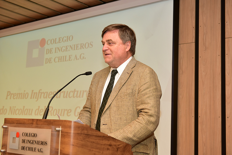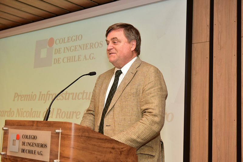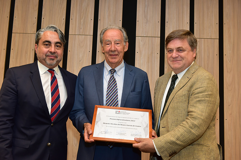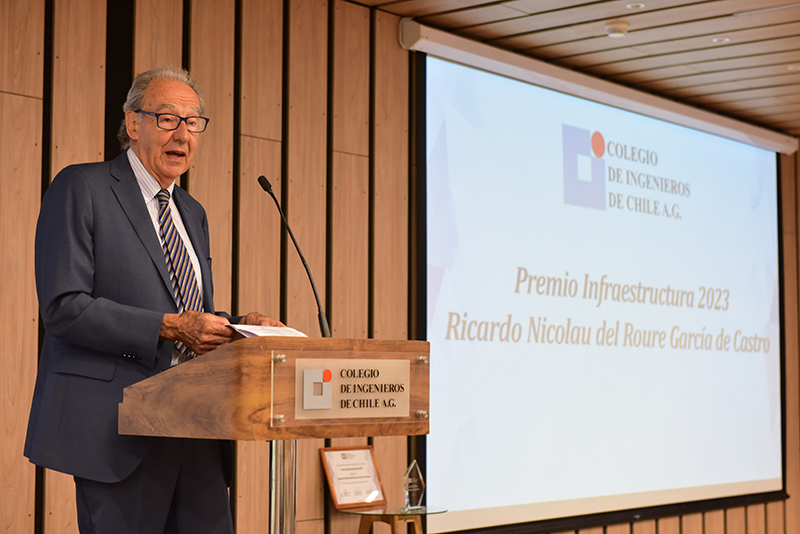 El jueves 4 de enero, en el Edificio del Colegio de Ingenieros, se realizó la ceremonia de entrega del Premio Infraestructura 2023, el cual fue otorgado al ingeniero Ricardo Nicolau del Roure García de Castro por su destacada trayectoria en el campo de la ingeniería civil estructural y en la gestión de proyectos de infraestructura a nivel nacional e internacional. Con más de 55 años de ejercicio profesional, ha contribuido en el ámbito de la docencia e investigación de la ingeniería en las Universidades de Chile, Concepción, Santa María y Texas en Estados Unidos.