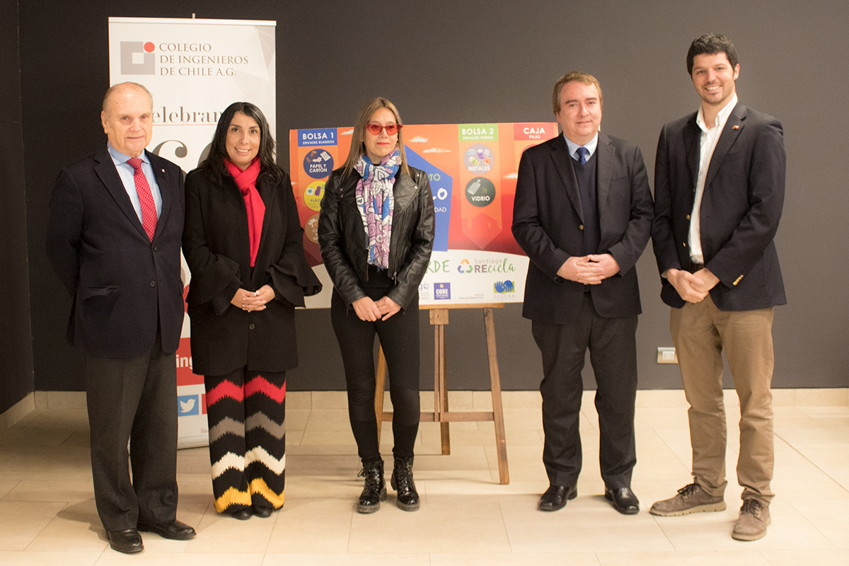 Arturo Gana, presidente Colegio de Ingenieros; Karla Rubilar, Intendenta Región Metropolitana; Ronald Mc Ginty, presidente Comsión Medio Ambiente Colegio de Ingenieros; representante Core y Diego Riveaux, Seremi de Medio Ambiente Región Metropolitana en la entrega de "Resultados del estudio diagnóstico gestión de reelección segregada de residuos domiciliarios".