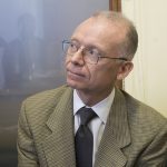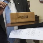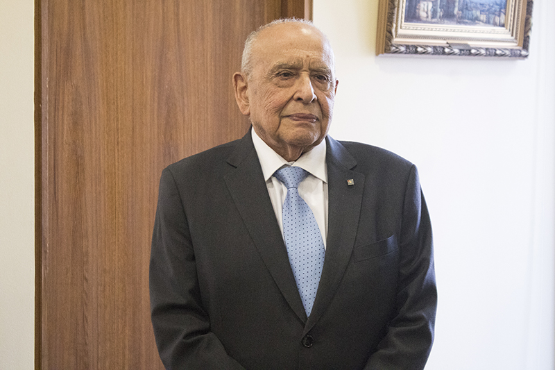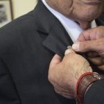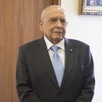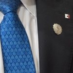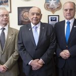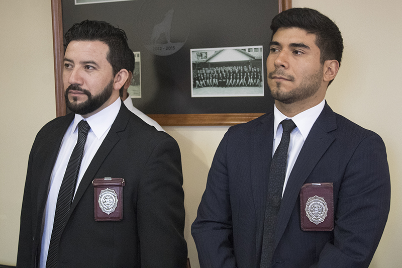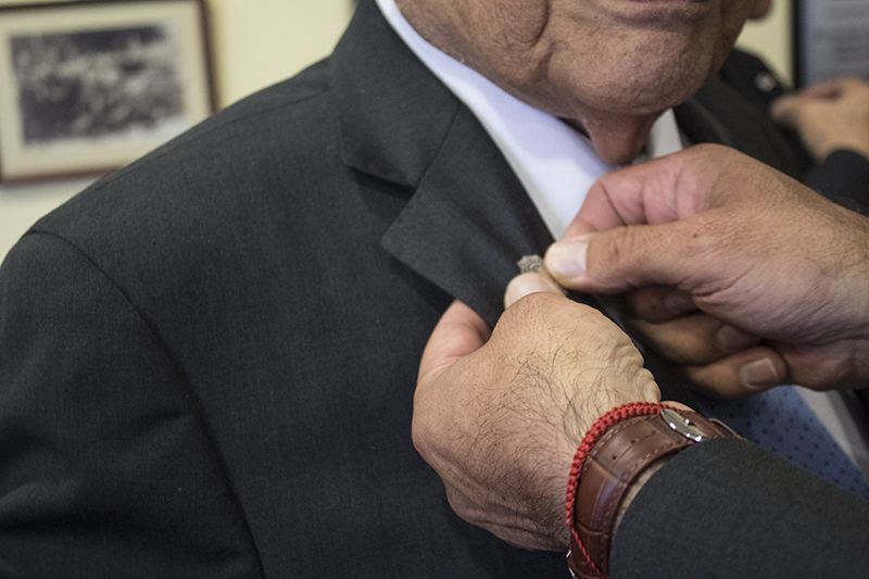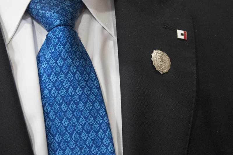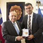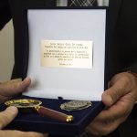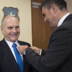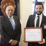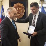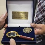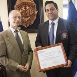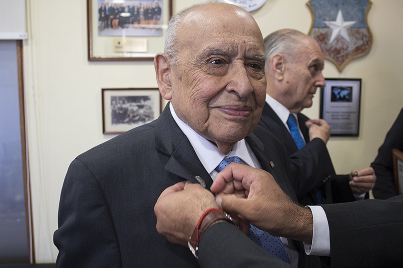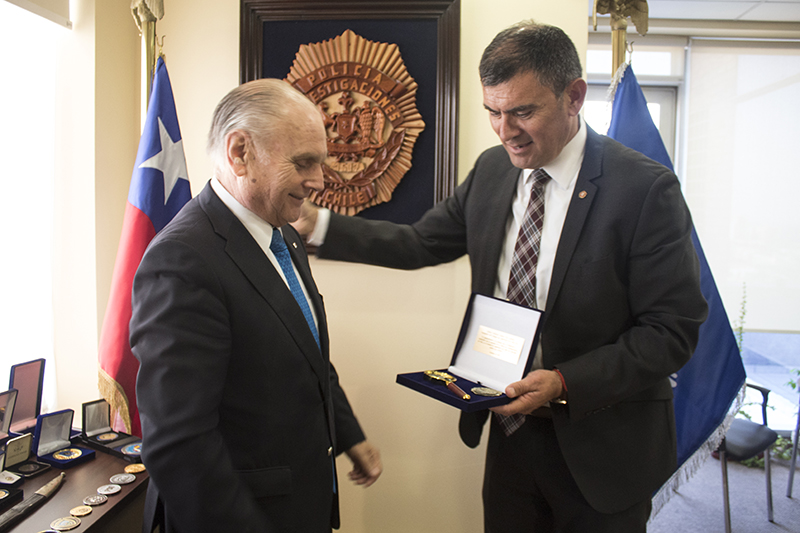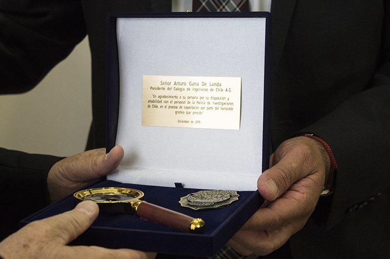 - El presidente del Colegio de Ingenieros de Chile, Arturo Gana, recibe el signo de agradecimiento por la colaboración del Colegio, una lupa y una insignia, de manos del Jefe Nacional de la Jenacrof, prefecto inspector Iván Villanueva.
