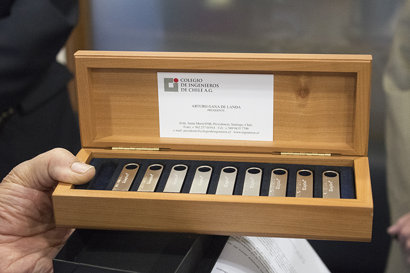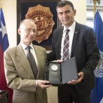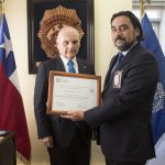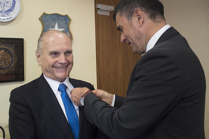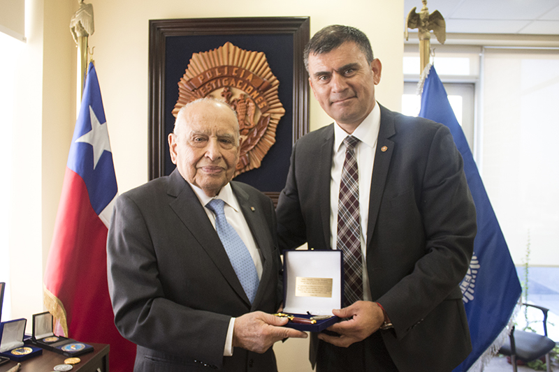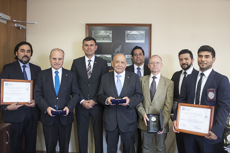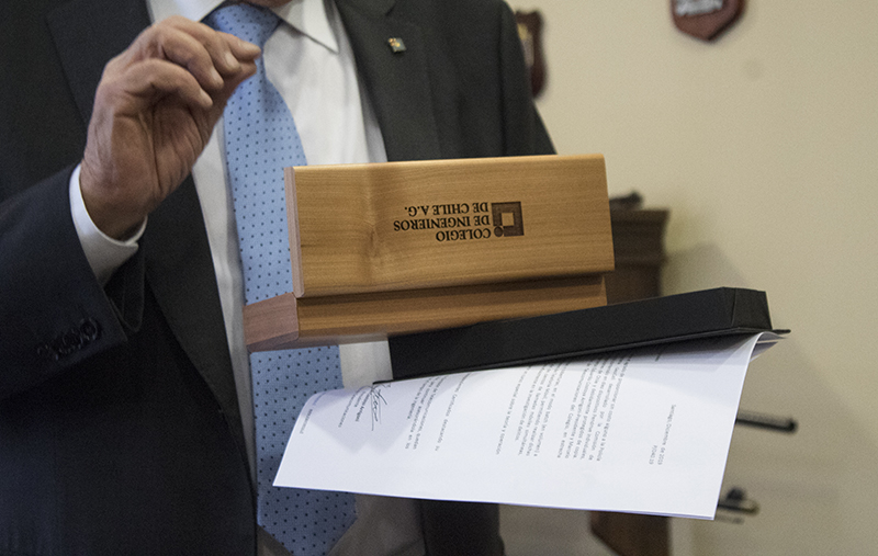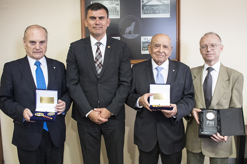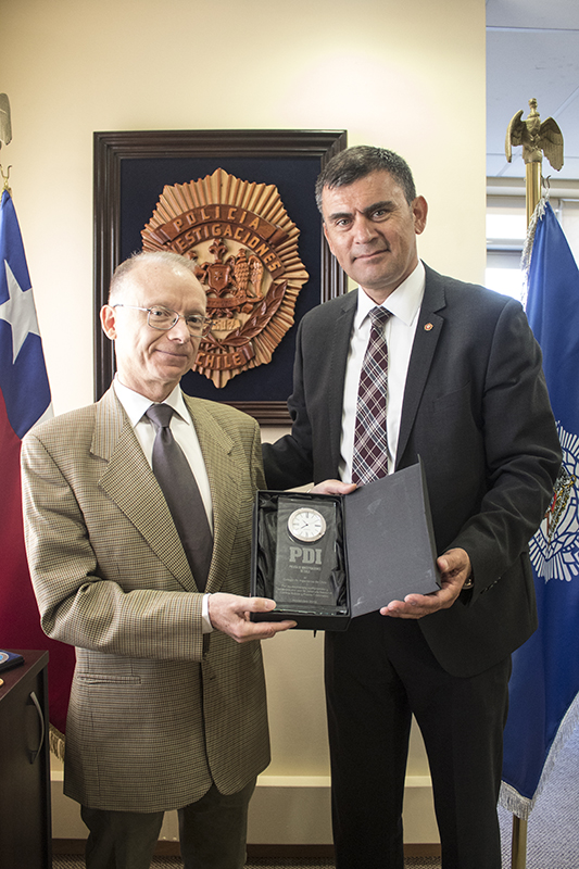 - El presidente del Colegio de Ingenieros de Chile, Arturo Gana, recibe de parte del Jefe Nacional de la Jenacrof, prefecto inspector Iván Villanueva un reconocimiento de la PDI.