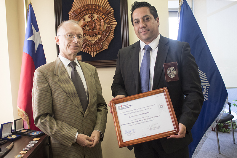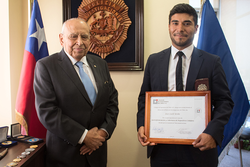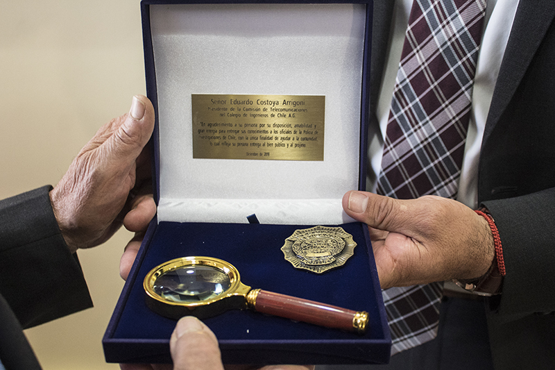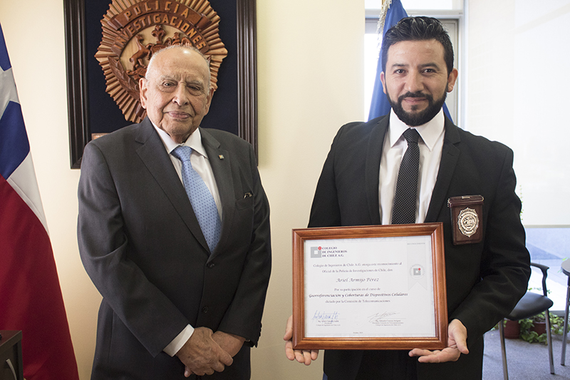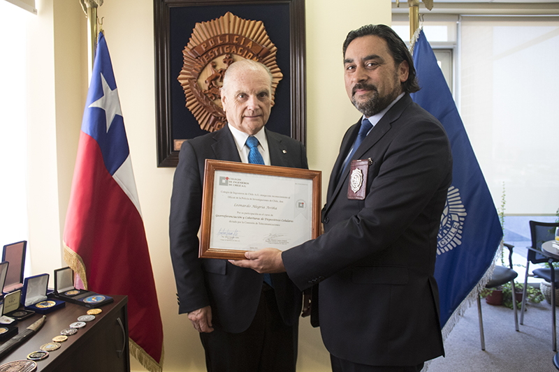 - El presidente de la Especialidad de Telecomunicaciones del Colegio de Ingenieros, Eduardo Costoya, recibe de parte del Jefe Nacional de la Jenacrof, prefecto inspector Iván Villanueva un reconocimiento de la PDI.