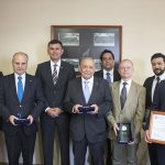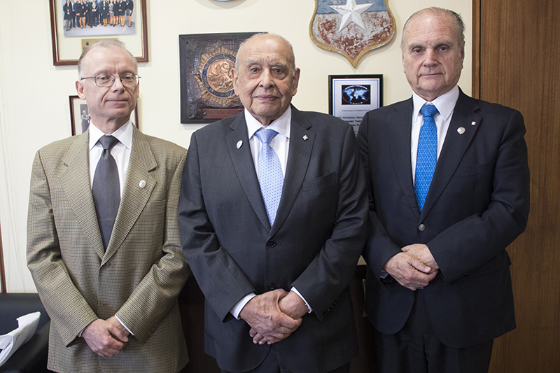 - El ingeniero Marcelo Pandolfo junto al presidente del Colegio de Ingenieros de Chile, Arturo Gana y el presidente de la Especialidad de Telecomunicaciones del Colegio de Ingenieros, Eduardo Costoya.