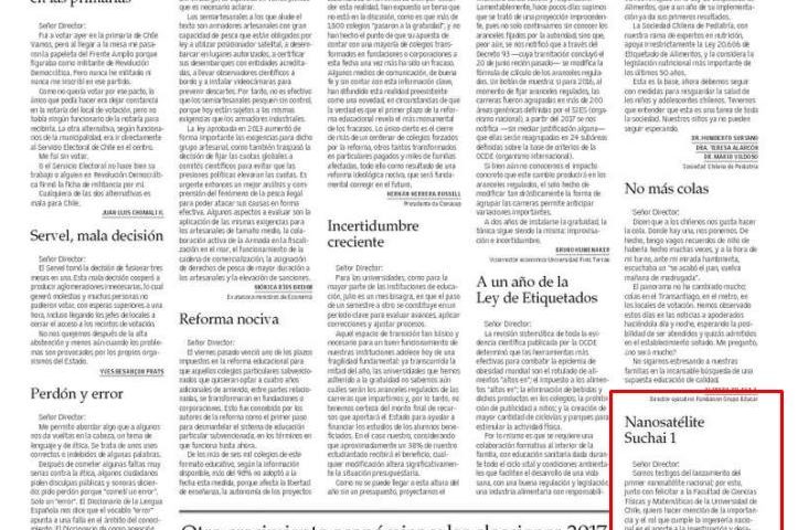 Presidente Nacional, Cristian Hermansen de nuestra institución hace extensivo el reconocimiento “…a cada uno de los integrantes del equipo que ha permitido tener hoy al Suchai 1 en órbitareconocimiento por SUCHAI 1” en el Mercurio (Cartas al Director Pág. 2)