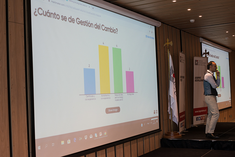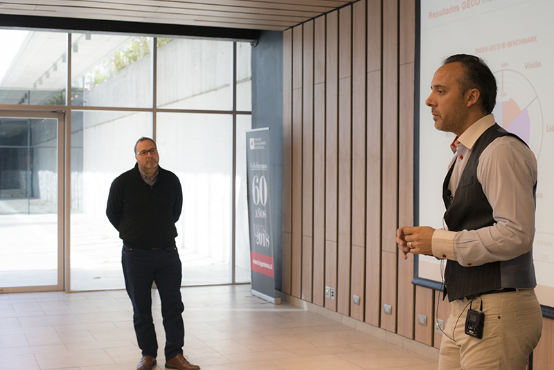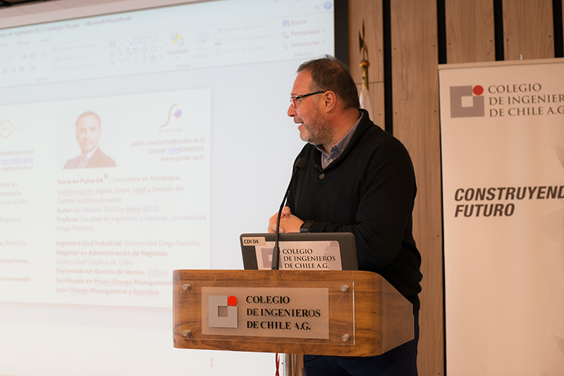 La segunda exposición de la charla estuvo a cargo de Pablo Mac-Carte, quien abordó la importancia de gestionar los proyectos estratégicos de cambio organizacional, relevando esta función a un nivel estratégico. El ingeniero presentó su modelo de GECO en el cual describió una gestión del cambio que va más allá de la gestión de las personas y sus resistencias, identificando las inercias organizacionales como un factor crítico a gestionar por los agentes de cambio. También señaló que gestionar estos procesos de cambio debe considerar la articulación de fuerzas impulsoras que ayuden a contraatacar la detractoras. En el modelo GECO explicó las 4 dimensiones que son críticas para lograr los objetivos de los proyectos de cambio el liderazgo, ejercidos no sólo por los sponsores del proyecto, sino que por los agentes de cambio. En segundo lugar mencionó, la cultura, la cual puede no solo derribar un proyecto de cambio, sino que una estrategia completa. En tercer lugar, habló de la importancia de contar con un plan de cambio y estructura que lo soporte. En cuarto lugar, mencionó la importancia de desarrollar métricas para medir la evolución del proceso y tomar medidas. Y por último, los recursos que permitan sostener el estado de tránsito del cambio y su sostenibilidad en el tiempo. Finalmente presentó el indicador GECO Index el cual permite a las organizaciones medir su capacidad para gestionar los proyectos de cambio estratégico. Con este indicador es posible fortalecer las dimensiones claves que el proceso de transformación requiere para que sea exitoso.