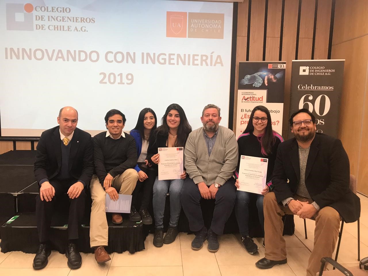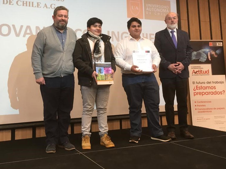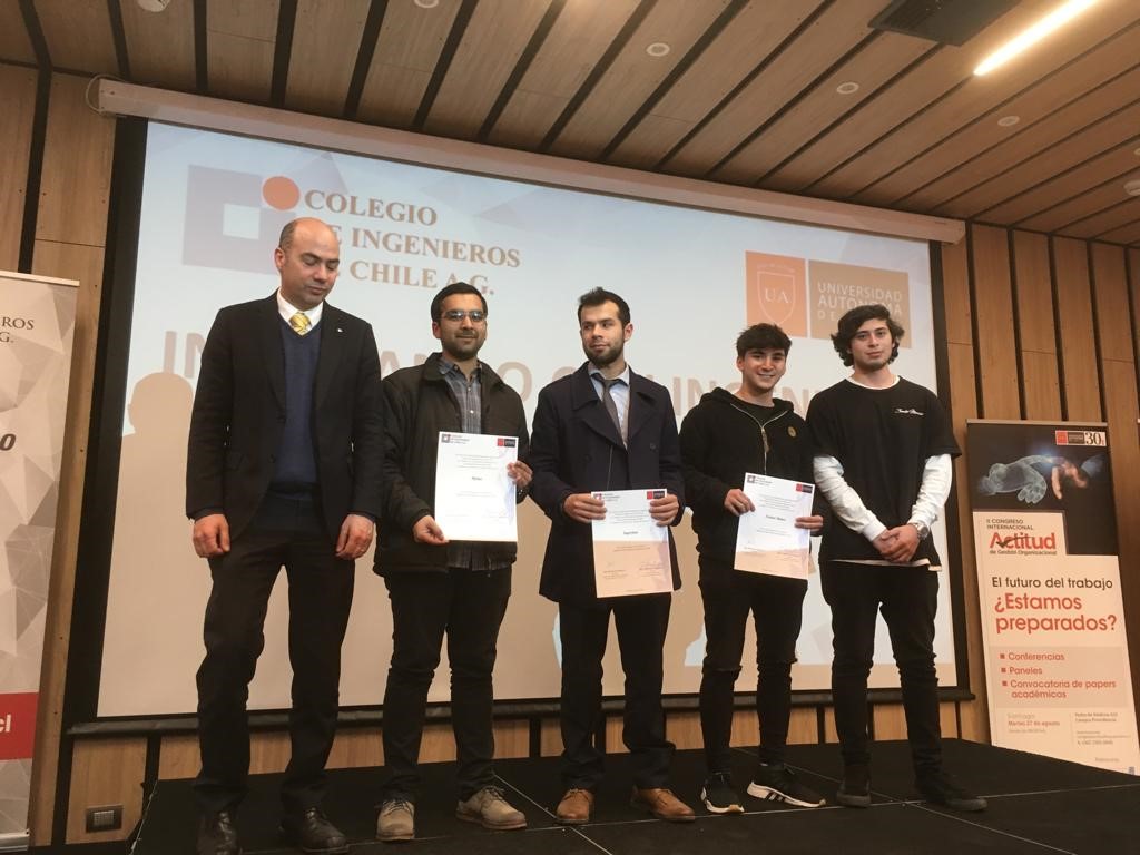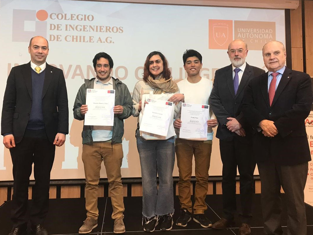 El martes 13 de agosto en la sede del Colegio de Ingenieros de Chile se realizó la premiación del Concurso Innovando Con Ingeniería. Esta actividad, desarrollada en el marco del Convenio de Colaboración entre nuestro Consejo de Especialidad Industrial y la Facultad de Ingeniería de la Universidad Autónoma de Chile, contó con la participación de 28 equipos correspondientes a cuatro universidades. En la oportunidad asistieron a la premiación el presidente del Colegio de Ingenieros, Arturo Gana, el decano de Ingeniería de la Universidad Autónoma de Chile, Guillermo Schaffeld, representantes de universidades y de los equipos premiados.