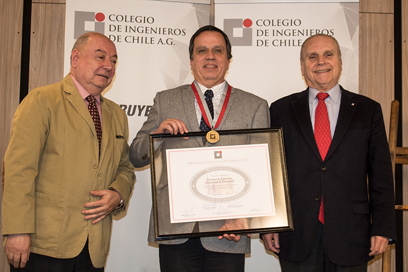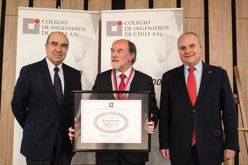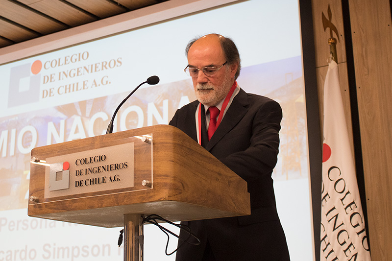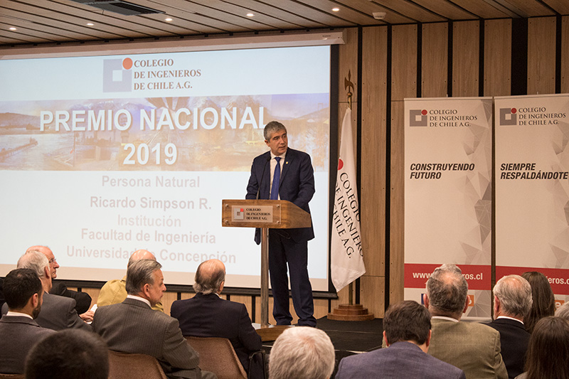 El jueves 22 de agosto se realizó la ceremonia anual de la entrega del Premio Nacional del Colegio de Ingenieros de Chile A.G., el cual busca condecorar al ingeniero y empresa que más haya destacado en razón de obras, servicios, estudios o proyectos realizados que contribuyan al desarrollo del país. En la versión de este año 2019, el Ing. Civil Ricardo Simpson en la categoría persona natural, y la Facultad de Ingeniería de la Universidad de Concepción en la categoría Institución, fueron los que recibieron el reconocimiento.