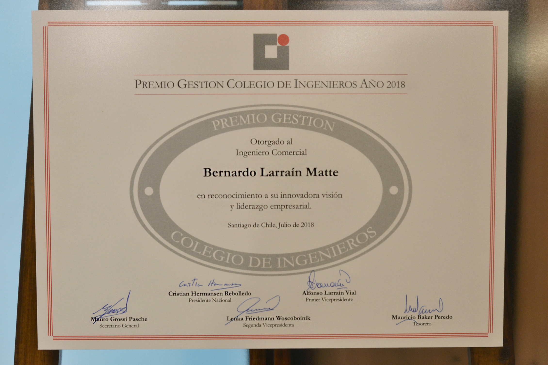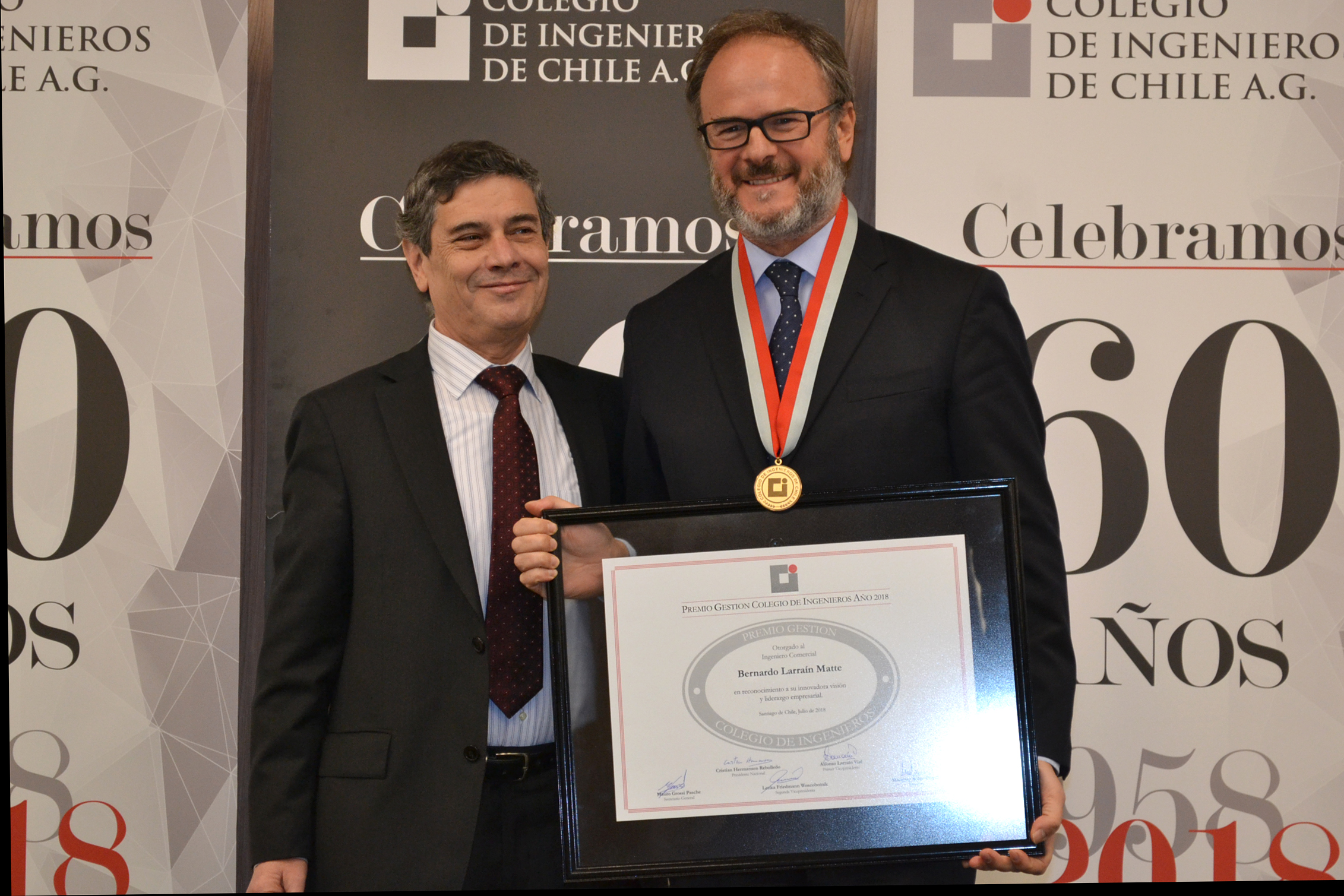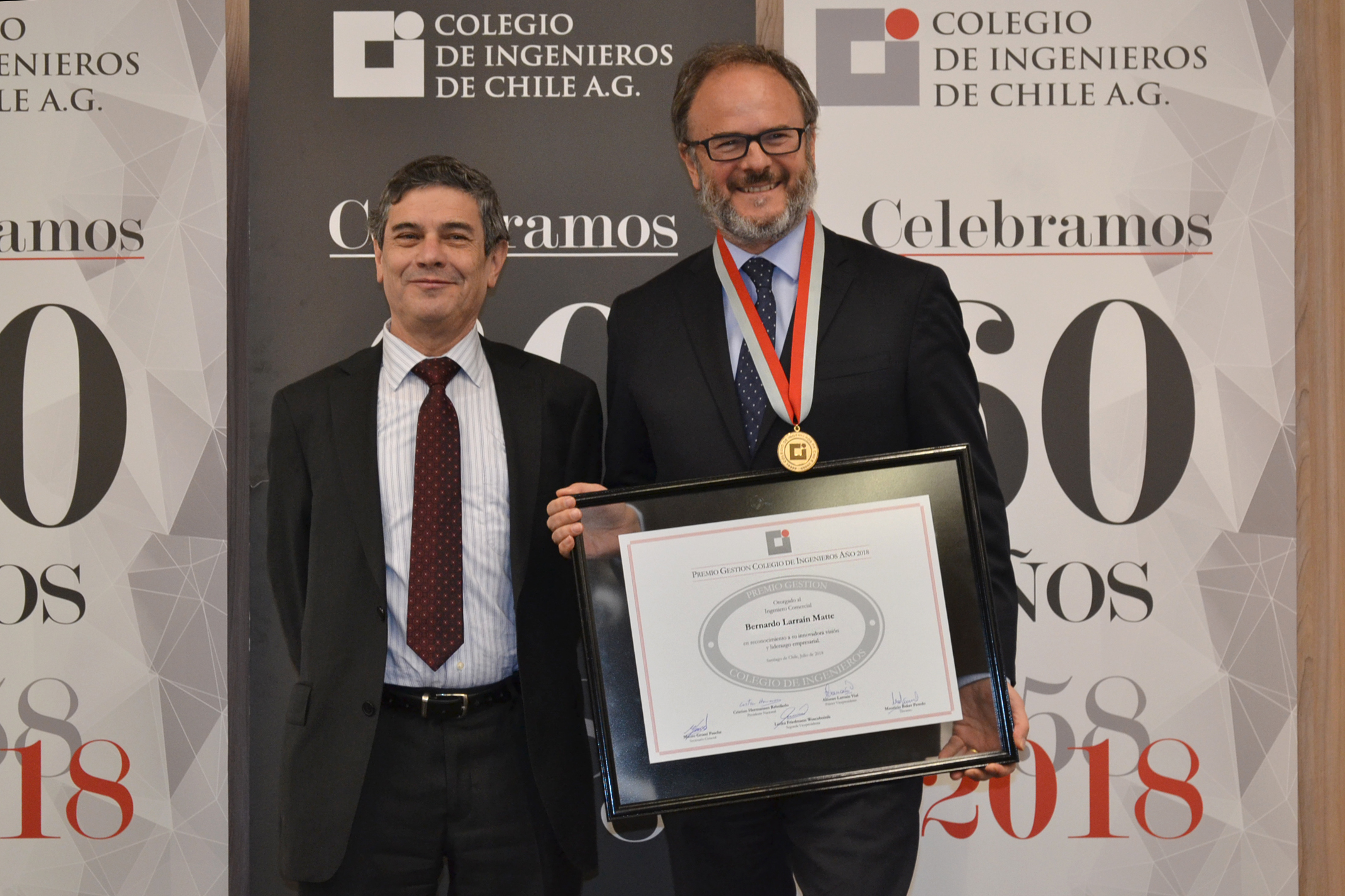 En la ceremonia de premiación, el presidente nacional del Colegio de Ingenieros, Cristián Hermansen, destacó el liderazgo técnico y humano de Larraín, y sostuvo que “en su trayectoria empresarial y gremial, Bernardo Larraín ha impulsado la modernización y la renovación, pensando en el futuro del país, con el espíritu de la ingeniería que significa avanzar en mejorar la calidad de vida de las personas”.