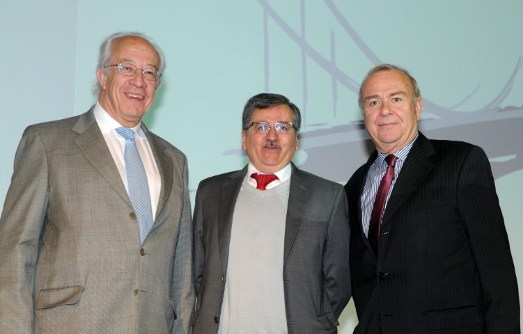 Foto: De izquierda a derecha, primer vicepresidente, Alfonso Larraín, Director Nacional de Vialidad del Ministerio de Obras Públicas, Walter Brüning y presidente del Consejo Especialidad Ingeniería Civil, Miguel Ropert.