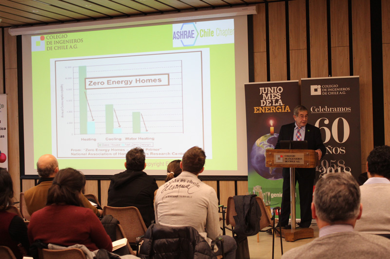 El primer expositor, Renato Miranda, Fundador ASHRAE Chile, abordó la “Calefacción y Aire Acondicionado Sustentable: Edificios de alta EE y/o Zero Energía”. Afirmó que “En las ciudades el 75% de las emisiones de gases de invernadero provienen de los edificios, en general con alto aporte de los edificios de vivienda que funcionan día y noche”.