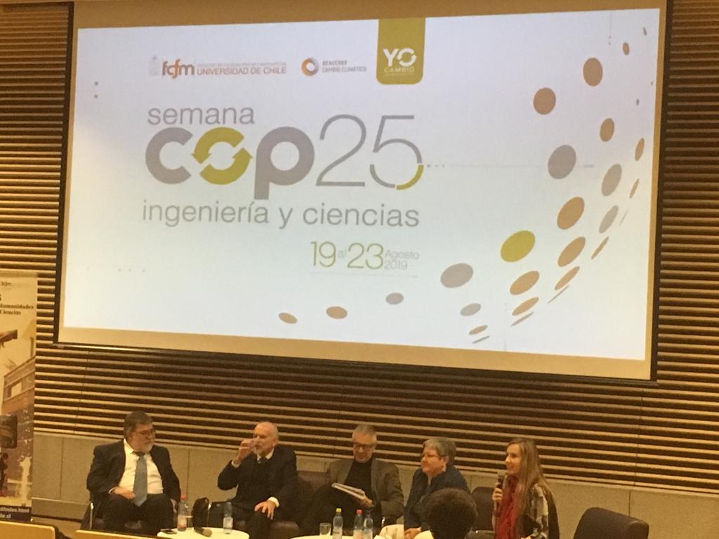 Entre el 19 y 23 de agosto, la Facultad de Ciencias Físicas y Matemáticas de la Universidad de Chile realizó la actividad COP25: Ingeniería y Ciencias, con el fin de poner en la agenda la discusión, análisis y acciones específicas para combatir el cambio climático. Arturo Gana, presidente de nuestro Colegio, asistió al cierre de la actividad, el cual se realizó el viernes 23 de agosto en el auditorio Enrique d´Etigny de la Facultad de Ciencias Físicas y Matemáticas de la Universidad de Chile.